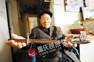 尹泰邦老人捧著的這把刺刀是妻子丁素蓮從日本鬼子手中奪過(guò)來(lái)的