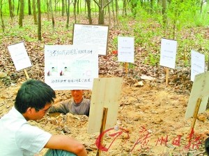 在沙井街道和一鴻江工業(yè)區(qū)對面的綠化帶上,只見一中年男子被土齊胸掩埋,舉著“生不如死”等字樣的牌子。一青年男子坐在坑邊,旁邊撲著一中年女人。中年男子告訴記者,他名叫胡顯柱,湖南新田縣人,今年45歲,膝下兩個兒子。他本人于1997年來深圳打工,現(xiàn)全家人均在寶安打工。