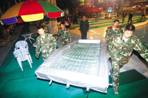它的體重只有30公斤,長(zhǎng)僅3.6米、寬1.6米、高0.2米。它就是“新型便攜式冰上(水面、沼澤)救援平臺(tái)”。在歷時(shí)三年和200余次的試驗(yàn)后,昨天終于在世人面前亮相了。昨天晚上7時(shí)50分,石家莊市公安消防支隊(duì)第十中隊(duì)的官兵們應(yīng)記者邀請(qǐng),在天山海世界對(duì)它進(jìn)行了一番試驗(yàn)。