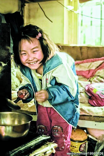 照片上的小女孩手持舀粥勺,卻笑容燦爛,臉上滿是陽光。