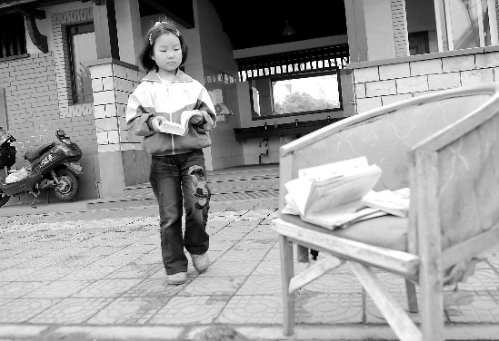 聊了一會(huì)兒,她下床拿起床下的小凳子和作業(yè)本,來(lái)到公廁外的人行道上。這里放著一張破損的舊椅子,海綿從紅色的坐墊下露了出來(lái)。小嘉雯收拾了椅子上的報(bào)紙,沒(méi)有發(fā)現(xiàn)那上面正登著她的照片。