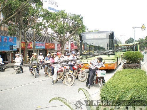 昨日(25日)下午,一輛滿載小食品的大貨車行至南寧市五一東路29號附近時,由于將橫穿馬路上空的電纜線刮落,同時導(dǎo)致5根水泥電線桿斷裂歪倒,車輛通行受阻。事故發(fā)生后,交警、城管等部門立即找來竹梯,將墜落的電纜線支撐起來,使過往車輛能緩慢通行。