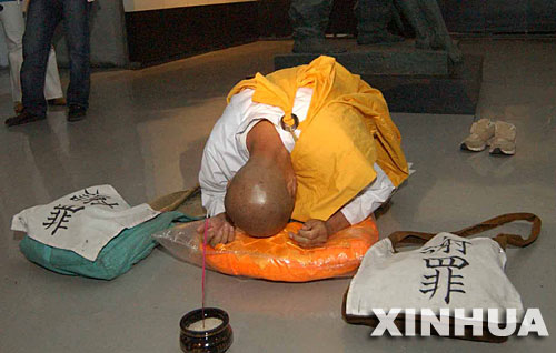 資料圖片:2006年5月11日,日本僧人巖田隆造在哈爾濱侵華日軍第七三一部隊(duì)罪證陳列館的活體試驗(yàn)展廳為侵華日軍的當(dāng)年惡行謝罪。王茜 攝