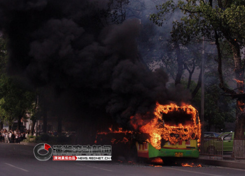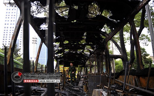 (17時(shí)30分,大火被撲滅,整個公交車已被燒成空空的鐵架子。圖/瀟湘晨報(bào)滾動新聞記者 趙尚渝)