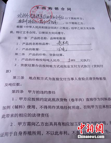 圖為張家口市橋東區(qū)工商管理提供的羊肉卷購銷合同。中新網(wǎng)發(fā) 譚地 攝