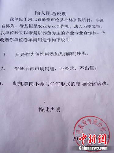 圖為滄縣恒興農(nóng)業(yè)專業(yè)合作社簽署的《用途說明》,明確寫著:只做魚飼料添加劑(輔料)。中新網(wǎng)發(fā) 譚地 攝