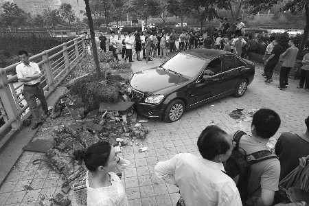 記者趕到現(xiàn)場時看到,一輛棗紅色的奔馳200轎車?吭谛轮衤仿房诘娜诵械郎希揭言诂F(xiàn)場拉起警戒線,一名交巡警正在對現(xiàn)場進(jìn)行勘察。轎車抵在一棵行道樹下的堡坎上,車頭已經(jīng)嚴(yán)重變形,堡坎的一半已被撞垮,碎石塊散落一地。在轎車的左側(cè)車門邊,一攤鮮紅的血跡依然清晰可見。而路邊約1米高的花臺里的植物,順著人行道一側(cè)的方向倒下了一片。一名約20多歲的年輕女子在車邊不停地哭泣。這名身穿連衣裙、著平底鞋、長相漂亮的女子承認(rèn),奔馳車就是她駕駛的。