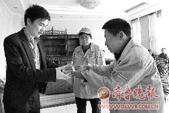 解福勝(右一)和李樹香一起將3.7萬元現(xiàn)金交還給酒店負(fù)責(zé)人。 本報(bào)記者 黃廣華 攝