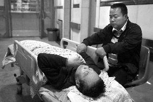 貨車(chē)車(chē)主陪護(hù)躺在病床上的父親。因石榴莊路面塌陷,貨車(chē)車(chē)主與當(dāng)時(shí)坐在副駕駛的父親均受傷。