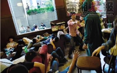 “殺人了!”昨日下午,長沙星巴克東塘店內(nèi)的座位被百名相約而來的網(wǎng)友相繼“霸占”。2點55分,網(wǎng)友們趴在桌子上,一起進入“夢鄉(xiāng)”,5分鐘后,網(wǎng)友們逐漸醒來,并繼續(xù)若無其事喝著咖啡。
