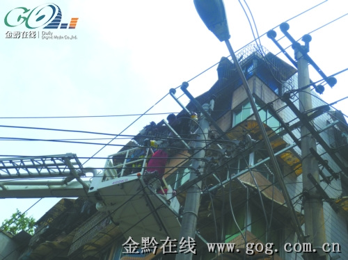 昨日(4日)早晨,貴陽市小十字蔡家街巷道一根電線桿上,一名正在維修電路的電工遭電擊,被困電桿,消防隊(duì)員經(jīng)過一小時(shí)的緊張救援,成功將傷者救下。目前,傷者身體多部位灼傷,正在醫(yī)院接受治療。