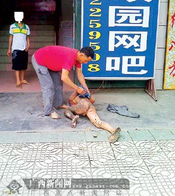 近日,在河池某網站論壇上一組題為“虐待兒童”的照片引起強烈關注:一名男子當街將一個男孩扒得一絲不掛,男孩倒在地上,滿身泥污,男子則拽著他的腿暴打他。5月5日,記者幾經周折找到了照片中的男子和男孩,發(fā)現他們是一對父子。10歲的小萌(化名)偷錢去上網,父親覃某發(fā)現后,一時氣憤,做出了過激舉動。他對記者述說著與網絡爭奪兒子的艱難和苦惱,數次落淚。
