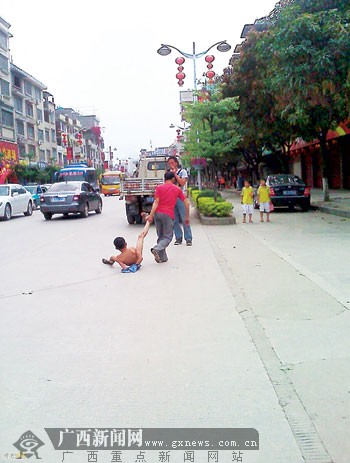 男子拖著全裸的男孩在路上走