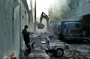 昨日下午3時(shí),市場(chǎng)拆除已經(jīng)開始,糧油區(qū)的失火商鋪被鏟車逐一推平,雜貨區(qū)和菜市場(chǎng)的攤位全部清空,商戶們將貨物堆放在路邊等待運(yùn)走。這些商戶們表示,他們已被安置在云龍市場(chǎng)以南數(shù)百米外的一處早市內(nèi)繼續(xù)經(jīng)營(yíng)。