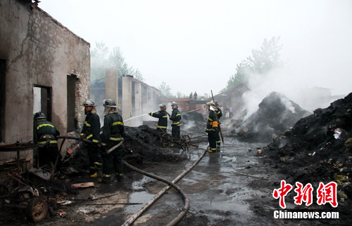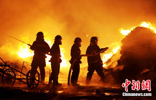 4時(shí)25分,消防官兵到達(dá)現(xiàn)場時(shí),火勢已處于猛烈燃燒階段。刺鼻嗆人的滾滾黑煙沖天而起,廠區(qū)內(nèi)的原材料在大火的包圍中熊熊燃燒,如果火勢得不到有效控制,與之相隔的廠房和附近居民區(qū)必將遭受火魔吞噬,有可能造成“火燒連營”的局面,后果將不堪設(shè)想。