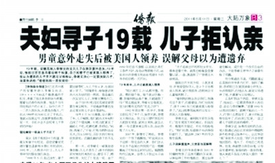 落戶蘇州的安徽蕪湖人李緒文,19年鍥而不舍尋子的故事經(jīng)本報(bào)披露后,得到社會(huì)各界關(guān)注。昨天,記者獲知最新進(jìn)展:民政部下屬的中國(guó)兒童福利和收養(yǎng)中心,省民政廳下屬的江蘇省涉外婚姻和涉外收養(yǎng)登記服務(wù)中心(以下簡(jiǎn)稱“江蘇雙涉中心”)均非常關(guān)注此事,并將在法律允許的范圍內(nèi)積極“搭橋”,聯(lián)系當(dāng)時(shí)的美國(guó)收養(yǎng)機(jī)構(gòu),轉(zhuǎn)達(dá)李緒文夫婦尋找李祥的消息。