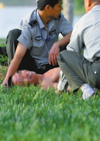 昨日下午,一名酒醉男子赤裸著上身,向掛有警示牌的天鵝湖深水區(qū)一步步走去。嚇得渾身是汗的施救人員急忙用計將該男子勸回岸邊。可面對施救人員,男子非但不領(lǐng)情,還對救援人員一頓喝罵,更讓人哭笑不得的是,為了嚇唬救援人員,醉漢還當(dāng)眾耍起了拳腳。