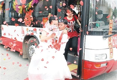 一輛嶄新的218路公交車停在里面,公交車正對前門地上鋪著一條大紅色的地毯,車身上貼滿了大紅的喜字,車內(nèi)也掛滿了五顏六色的彩帶和氣球。