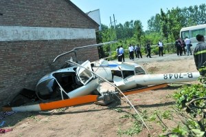 直升機墜落在一間民房墻腳。昨日上午,一架噴灑滅蟲藥的小型直升機在通州區(qū)張家灣鎮(zhèn)陸辛莊村西側(cè)的苗木市場墜毀,飛行員受傷。