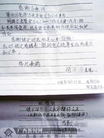 5月13日,南寧市茶花園小區(qū)大門的保衛(wèi)室門口貼出一張告示,提醒每個值班的門衛(wèi):不經梁××先生本人同意,停放在小區(qū)內車牌號為桂ASQ8×5的小車不得放行。居住在該小區(qū)的梁先生說,這輛車是他經婚介所介紹認識的對象張某與女兒何某要求他出錢購買的。購車后不久張某提出分手,何某想把車開走,被梁先生及時扣下。梁先生說,認識后一個多月內,張某母女以種種借口索要錢物達7萬多元。但張某說,出現(xiàn)這樣的結果,其實自己也很委屈。
