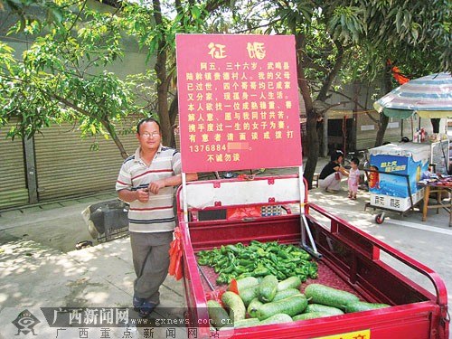 近日,武鳴縣靈水社區(qū)的菜市里經(jīng)常能看到一名特別的賣菜男子,他在運輸蔬菜的三輪車上豎起一塊“征婚啟事”,上面寫著自己的家庭情況和聯(lián)系方式,邊賣菜邊征婚。附近居民都覺得很新奇,稱他為“征婚哥”。