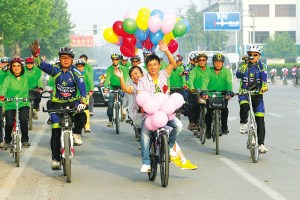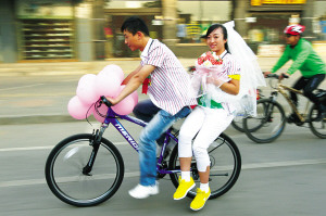 新郎馱著新娘,在眾多騎友陪伴下快樂地騎行在街上。記者 李青 攝