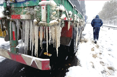 前晚7時(shí),近兩千人被困在八達(dá)嶺高速出京居庸關(guān)到水關(guān)長(zhǎng)城段。風(fēng)雪撲向車窗,大車司機(jī)李福海把車停在應(yīng)急車道,打開雙閃熄了火。他跟副駕駛小孫說,用不了多長(zhǎng)時(shí)間就能走。一個(gè)多小時(shí)過去,當(dāng)他想再次啟動(dòng)車輛,雨刷已經(jīng)推不動(dòng)前擋風(fēng)的積雪了。