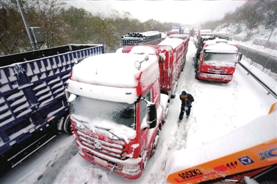 前晚7時(shí),近兩千人被困在八達(dá)嶺高速出京居庸關(guān)到水關(guān)長(zhǎng)城段。幾乎是同一時(shí)間,110國(guó)道昌平區(qū)和延慶縣交界處,至少1000輛車誤在風(fēng)雪里。