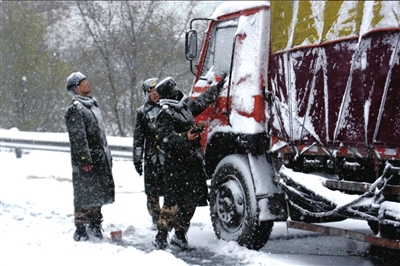 昨天上午7點(diǎn),陸續(xù)有武警官兵徒步抵達(dá)阻塞路段。胡;貞浀竭@段眼眶濕潤(rùn),看到當(dāng)兵的來了,整條路上被困了一夜的人都覺得看到了出去的希望。武警官兵挨車詢問情況,同時(shí)揮鍬人力清理路面積雪。