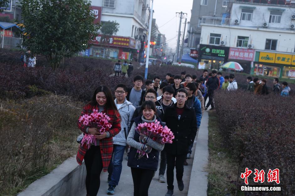12月30日,安徽省安慶市,安慶師范學(xué)院。小陶和小曹是2014級機械設(shè)計制造及其自動化一班僅有的兩名女生,為了給他們倆過生日,班長想出了獨特的創(chuàng)意。班上的55名男生每人手持兩朵玫瑰在女生宿舍前的道路上站了近兩百米長隊迎接兩名女生出門,兩名女生一邊走一邊收花,滿臉驚喜和幸福,也吸引了大批學(xué)生的圍觀。