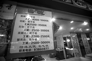 去年春節(jié)7天假期,飯店招臨時(shí)服務(wù)員工資在250元左右,洗碗工平均每小時(shí)30元,高的可達(dá)50-60元。