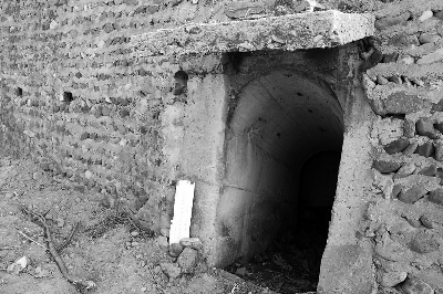 北側(cè)洞口直接嵌在擋土墻中,洞口瘦高、拱頂,足夠一人出入,門洞上方設(shè)一擋板,地道四壁為混凝土砌筑,看上去非常結(jié)實(shí)。進(jìn)洞后下臺(tái)階兩米后左轉(zhuǎn),里面一團(tuán)漆黑,用手電照射發(fā)現(xiàn)通道已被垃圾封阻。