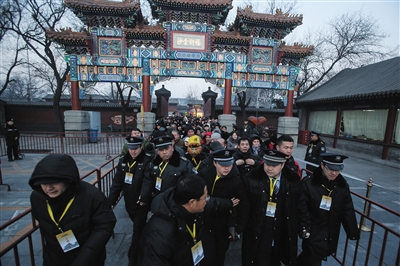 昨日,雍和宮大街,早7時(shí),安保人員手挽手在前排引導(dǎo)香客們從大門走向售票處。當(dāng)天是大年初一,大批游客與信眾前往雍和宮燒香祈福。本版攝影/新京報(bào)記者 彭子洋