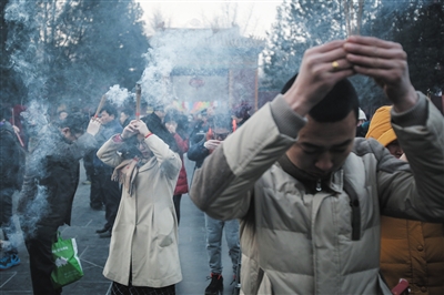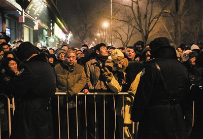 昨日凌晨5時(shí),雍和宮門前已排起百米長隊(duì),寬5米左右的通道擠滿了香客,被圍得水泄不通。不少排隊(duì)者穿著羽絨服棉鞋、頭戴棉帽,依然被凌晨的寒氣侵蝕,在原地來回跺腳,反復(fù)看著時(shí)間。