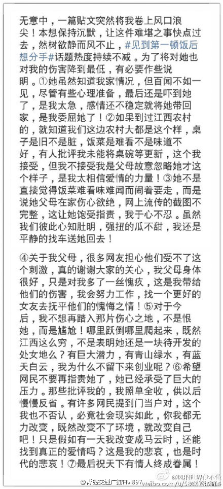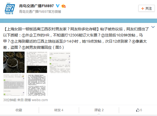 [上海女因一頓飯?zhí)与x江西農(nóng)村男友家?網(wǎng)友稱(chēng)多處存疑]帖子被熱議后,網(wǎng)友們提出了以下質(zhì)疑:①外企工作的HR,不知道打12306能訂火車(chē)票?②注冊(cè)后16分鐘發(fā)帖,馬甲?③上海到最近的江西上饒往返至少14小時(shí),她19點(diǎn)發(fā)帖,次日12點(diǎn)到家?④像素太差,盜圖?⑤其男友微博回應(yīng)(圖2)