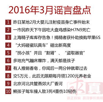 人民網(wǎng)北京4月7日電(記者孝金波 實習生韓亞云)3月,山東疫苗事件備受關注,衍生謠言隨之擴散;“充氣蹦床爆炸”等熱點事件被移花接木夸張傳播;“吃大盤雞感染禽流感”、“搶孩子”等舊謠改頭換面卷土重來……“求真”欄目對3月謠言進行盤點梳理,推出“盤點3月十大假新聞”榜單。