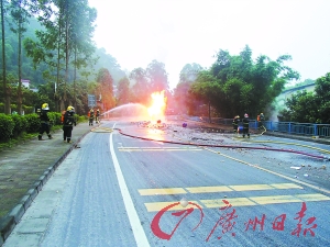 兩貨車相撞后,現(xiàn)場發(fā)生爆燃,55名消防員參加撲救。