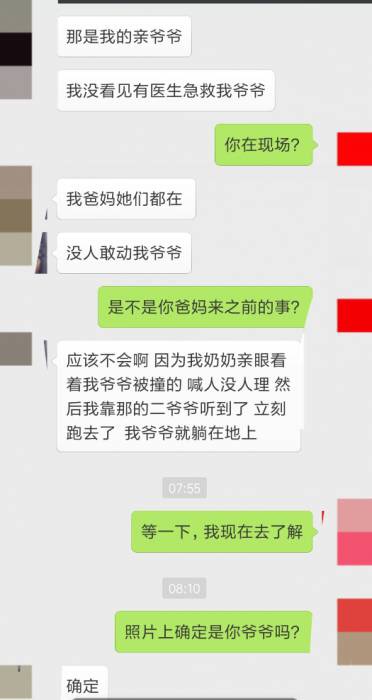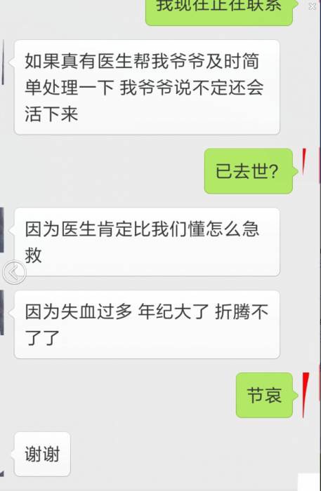 6月22日早上,一名自稱是傷者孫女的女孩與網(wǎng)友聊天的信息公布于眾,女孩稱:她并沒有看到有醫(yī)生急救她爺爺,她爸媽都在現(xiàn)場,是沒有敢動(dòng)爺爺?shù)。并稱,如果真有醫(yī)生幫及時(shí)簡單處理一下,爺爺說不定會(huì)活下來。