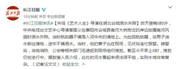 據(jù)長江日報官方微博報道,昨日(6月22日)傍晚6時許,中央電視臺文藝中心導演曾國義在襄陽市谷城縣南河大橋附近的岸邊拍攝南河風貌時溺水失蹤。當時航拍器不慎落入河中央的灘地上。為撿回航拍器,該男子淌水前往灘地,途中不慎溺水。當時,他的妻子也在現(xiàn)場,見狀后連忙報警。接警后,當?shù)叵、公安等相關(guān)部門迅速趕到現(xiàn)場組織搜救。截至今天早上6時,搜救仍在進行中。據(jù)救援人員介紹,此處的河水看起來很淺很平坦,實則水域非常復雜。