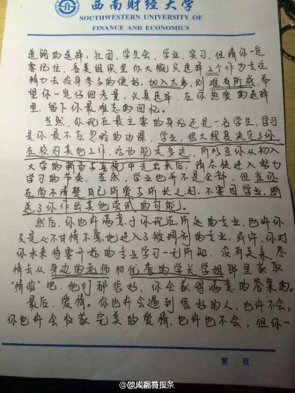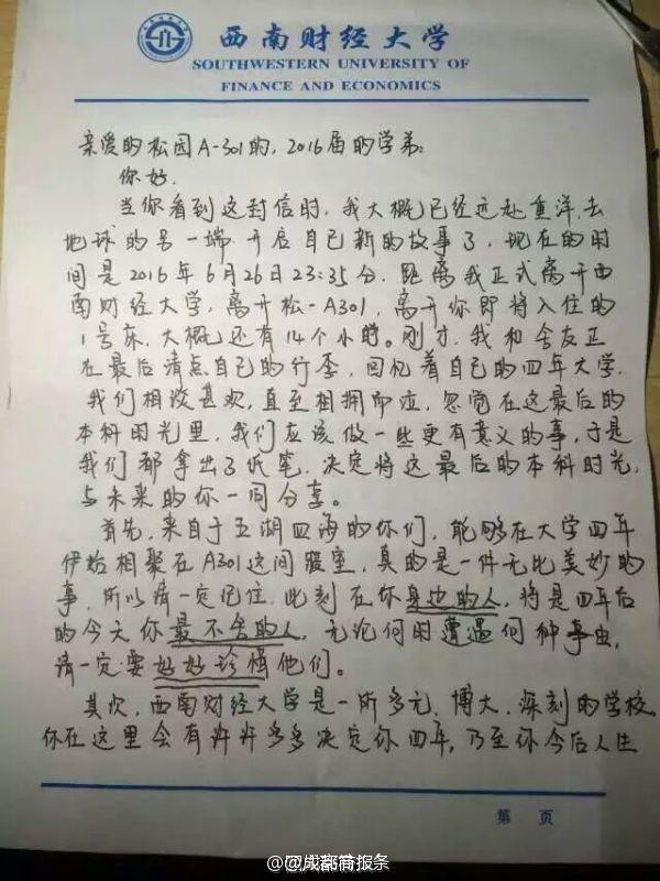 未見卻真情!畢業(yè)學(xué)長給未來同寢學(xué)弟留“內(nèi)心獨(dú)白”】西南財(cái)經(jīng)大學(xué)的劉陽,在畢業(yè)離校前夜,給未來入住寢室的學(xué)弟留下一封信:“此刻在你身邊的人,將是4年后的今天你最不舍的人”“對于愛情,即使是痛苦也會(huì)令你有所收獲”…學(xué)弟看到會(huì)不會(huì)滿滿感動(dòng)?via四川高校頭條