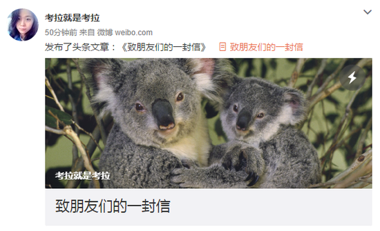 我對(duì)自己年輕單純、涉世未深、偏執(zhí)盲目鑄成的大錯(cuò)感到追悔莫及,并真心悔悟,我愿為我的過(guò)錯(cuò)承擔(dān)責(zé)任,今后我將告別舊我,不負(fù)韶華,給大家展現(xiàn)一個(gè)全新的考拉。