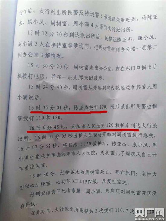陳亞杰這樣描述當(dāng)時(shí)的經(jīng)過(guò):他說(shuō)不舒服的時(shí)候我就馬上打的120,我說(shuō)太行派出所有人暈倒了,(120)他說(shuō)哦,馬上到!我記得很清楚,對(duì)方是 個(gè)男的。打過(guò)120之后急救車(chē)已經(jīng)過(guò)來(lái)了,但是沒(méi)進(jìn)院里,我聽(tīng)見(jiàn)聲音了,到了之后又走了。我媽說(shuō)了一句怎么來(lái)了又走了,我趕緊15點(diǎn)37分又給120打了 一次。我說(shuō)趕緊過(guò)來(lái)唄,那邊說(shuō)已經(jīng)派車(chē)過(guò)去了。