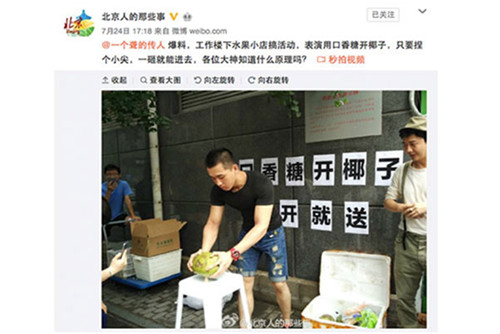 在微博上曬圖用口香糖打開椰子的網(wǎng)友,都是將口香糖做成圓錐狀,放在一個固定的平面上,用雙手將椰子迅速地砸向口香糖,瞬間,椰子就被戳出一個開口。還有的網(wǎng)友突發(fā)奇想用口香糖開香瓜、開哈密瓜,甚至有的水果店還趁勢搞起了“口香糖開椰子,打開就送”的促銷活動,吸引很多路人圍觀參與。