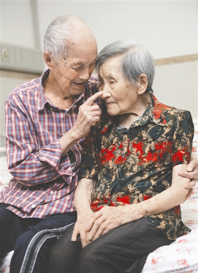 “老都老了,但是越老越恩愛(ài)!卑贇q老人曹越華將臉輕輕貼在百歲妻子王德懿的臉上,大聲說(shuō)道,王德懿老人微微點(diǎn)了點(diǎn)頭。兒子曹龐沛告訴記者:“父親耳背,他以為還在跟母親說(shuō)悄悄話。”
