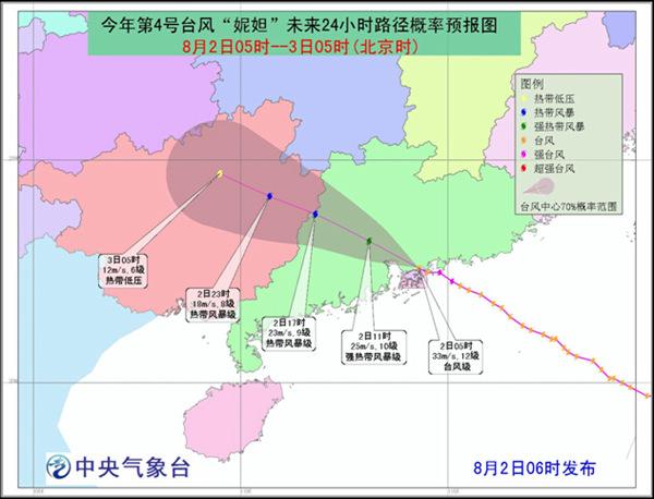 預(yù)計,“妮妲”將以每小時25公里左右的速度向西偏北方向移動,強度繼續(xù)減弱,將于2日傍晚前后進入廣西境內(nèi),隨后于2日夜間在廣西境內(nèi)減弱為熱帶低壓。