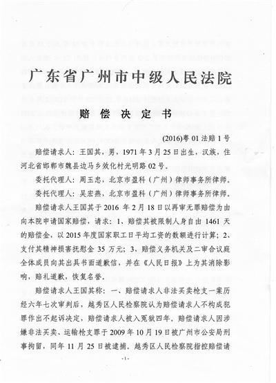 廣州中院查明,王國(guó)其因犯非法買(mǎi)賣、運(yùn)輸槍支罪,于2009年10月19日被羈押,歷經(jīng)上述司法程序,最終被檢察機(jī)關(guān)認(rèn)為不構(gòu)成犯罪,決定對(duì)其不起訴。另查,王國(guó)其于2013年10月18日被取保候?qū)彛?014年4月18日被解除取保候?qū)彙?/p>