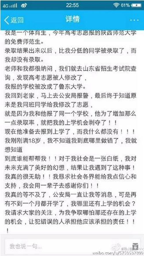 然后7月23日這天,這報(bào)考的這一批次的征集志愿下來(lái)了,這時(shí)候,他才驚訝的發(fā)現(xiàn),征集志愿中,竟然有一個(gè)陜西師范大學(xué)免費(fèi)師范生的名額。他的同學(xué)比他分?jǐn)?shù)低,都被陜西師范大學(xué)錄取了,而他的分?jǐn)?shù)還要高一些,竟然沒(méi)被錄取,而且,根本就沒(méi)有招滿。學(xué)校沒(méi)招滿,還不錄取分?jǐn)?shù)足夠的他,這是為什么?于是,他這才想起來(lái)去查閱自己的報(bào)考記錄,結(jié)果讓他大吃一驚。他根本就沒(méi)有報(bào)陜西師范大學(xué),他的記錄,被改成了魯東大學(xué)的體育休閑教育專業(yè)。