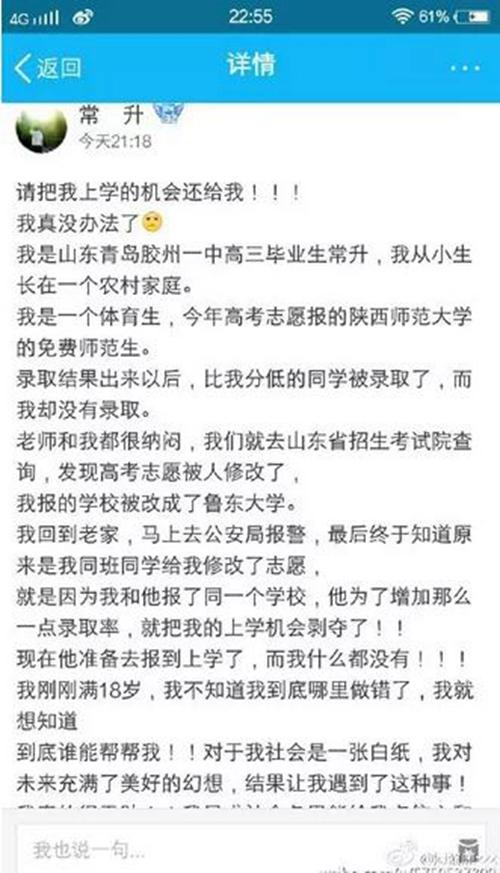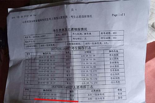 8月1日深夜,多位青島膠州的朋友向半島記者爆料,青島膠州一中一位叫做常升的高三考生,今年報(bào)考陜西師范大學(xué)的免費(fèi)師范生,但志愿竟然被人偷偷篡改,結(jié)果導(dǎo)致自己上不了大學(xué)!這位考生懷疑是自己的同班同學(xué)偷改了他的志愿,這位同學(xué)報(bào)考了和他一樣的大學(xué),分?jǐn)?shù)比他還要低,結(jié)果這位同學(xué)被陜西師范大學(xué)錄取,而自己等來(lái)等去,沒(méi)有錄取結(jié)果,上網(wǎng)一查,才發(fā)現(xiàn)自己的志愿已經(jīng)被改了!