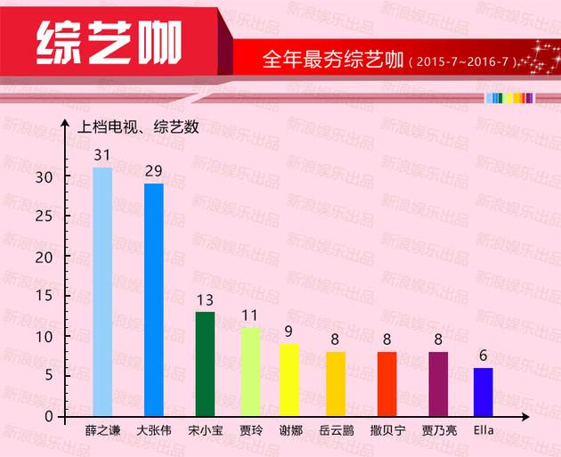 當(dāng)我們討論一個(gè)藝人究竟算不算綜藝圈兒里的大紅人時(shí),先看看到底有多少檔節(jié)目愿意請(qǐng)他去做嘉賓吧!這是最簡(jiǎn)單直觀的。在此,我們以“年”為單位(去年7月左右-今年7月),把一年內(nèi)上檔(或已錄完,即將上檔)的電視、網(wǎng)絡(luò)綜藝進(jìn)行了一番梳理,以下幾位便是獲邀參與綜藝節(jié)目數(shù)量最多的紅人兒。