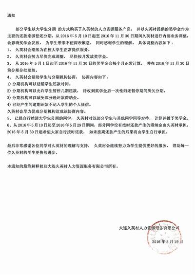 經(jīng)過(guò)多番協(xié)商,當(dāng)晚久英材給出了一份書面通知。這份蓋有久英材公章的通知顯示,久英材承認(rèn)學(xué)生“以大學(xué)生分期的方式購(gòu)買了久英材的服務(wù)產(chǎn)品,并以久英材提供的獎(jiǎng)學(xué)金作為主要的還款來(lái)源償還分期”。久英材表示,11月30日之前,由于公司進(jìn)行內(nèi)部業(yè)務(wù)調(diào)整,導(dǎo)致獎(jiǎng)學(xué)金無(wú)法正常發(fā)放。久英材承諾,在此期間會(huì)和分期機(jī)構(gòu)協(xié)商,允許學(xué)生暫停幾期還款。